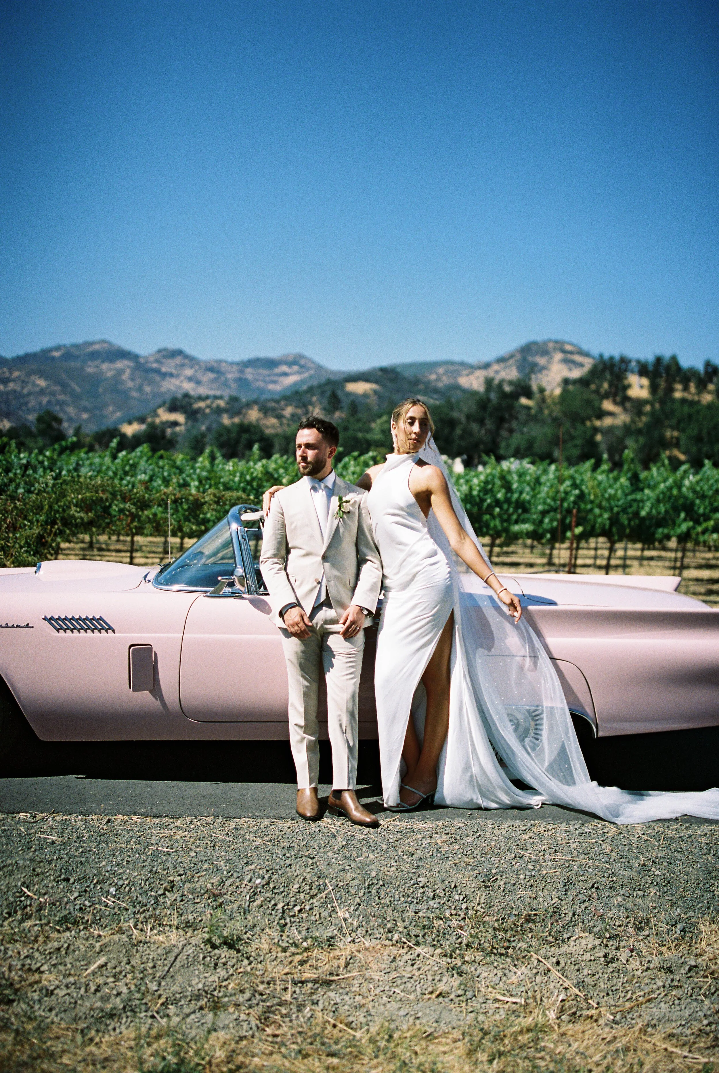 Olivia + Chris brought the party with their extensive wedding weekend celebrations and a crew of professional dancers. After celebrating throughout the Napa Valley, Olivia’s dream palette of warm neutrals and ethereal grasses was set against the summery golden hills surrounding the Four Seasons Calistoga for an epic wedding reception. NYC-based DJ Taela spun a Palm Springs pool party vibe at cocktail hour and returned for the after party to turn up the heat with a packed dance floor - and a surprise performance by Olivia and her dancer friends. Keeping guests shaded and cool throughout was a high priority, and beautiful custom shade structures were installed amongst detail-rich furnishings, florals and textiles. Wedding Chicks’ feature highlights the very cool pink Thunderbird Chris rented as a surprise to whisk Olivia away from the church! Head over there for more photos and fabulous details.